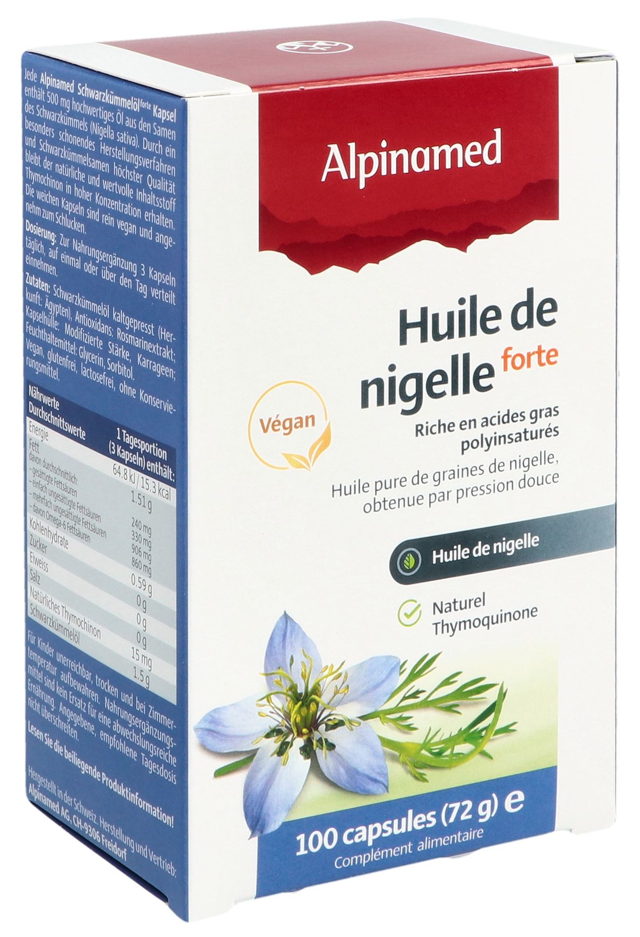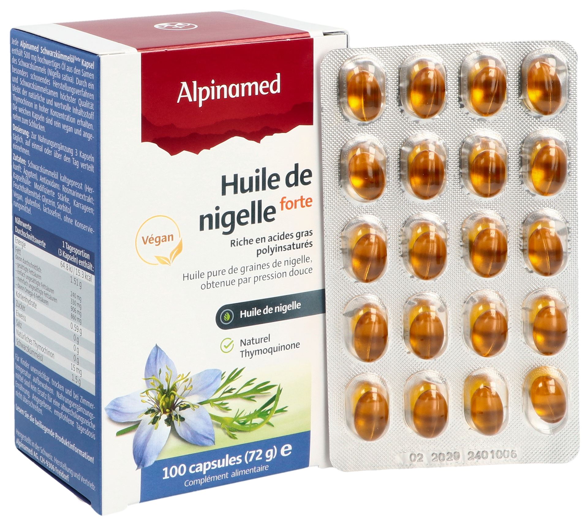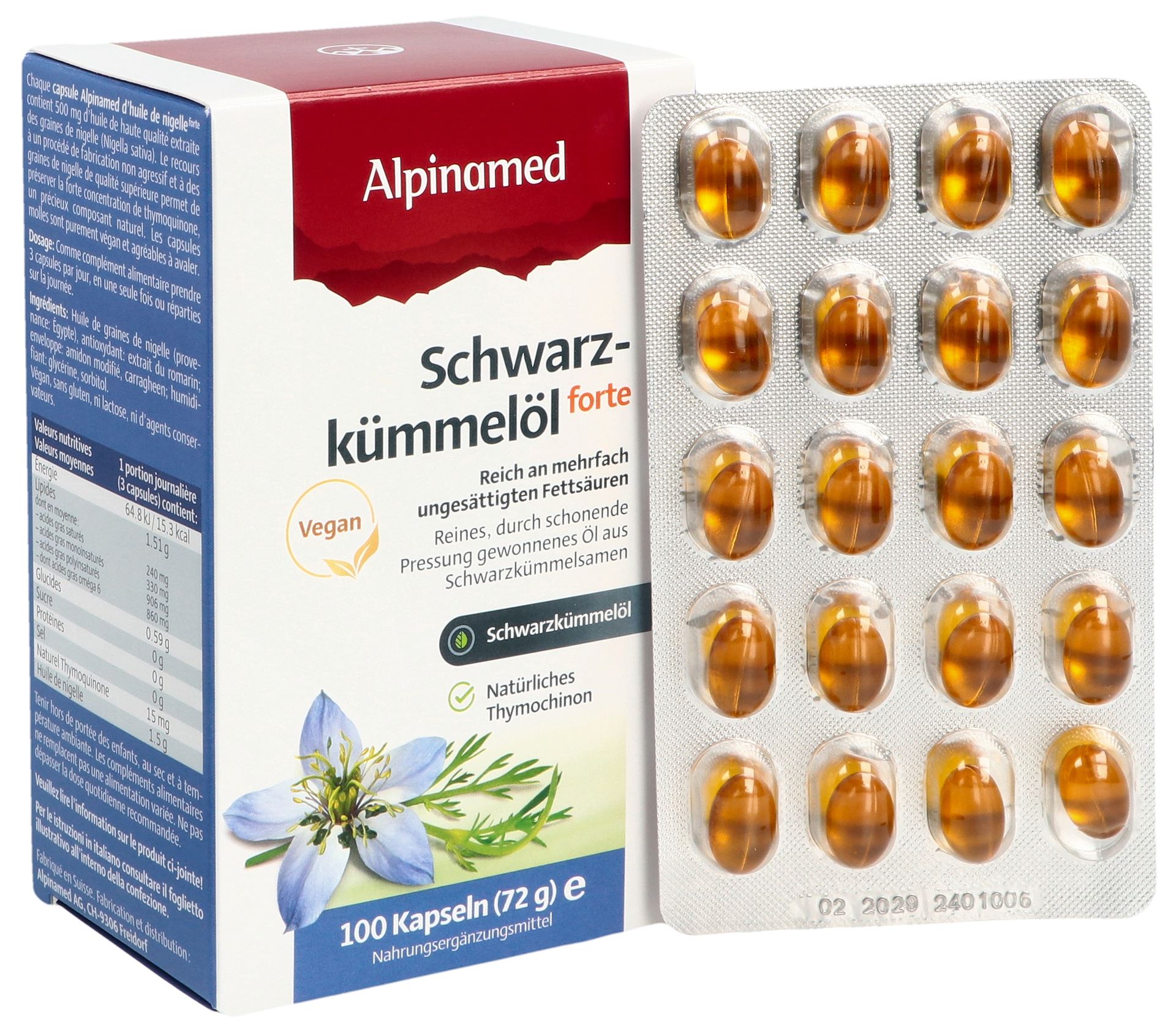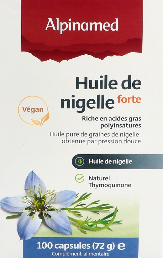 Ogni capsula di olio di cumino nero Alpinamed contiene 500 mg di olio puro ottenuto per spremitura soffice da semi selezionati di cumino nero egiziano (Nigella sativa). Questo olio naturale di cumino nero è ricco di timochinone, un componente di alta qualità garantito da un’attenta lavorazione e dall’utilizzo di semi di cumino nero di prima qualità. In questo modo si preservano anche i preziosi acidi grassi polinsaturi. L’olio di semi di cumino nero contiene naturalmente preziose sostanze vegetali secondarie e oli essenziali. I semi di cumino nero sono una preziosa fonte di ferro, rame, zinco, fosforo, calcio, vitamina B1, B3 e acido folico.